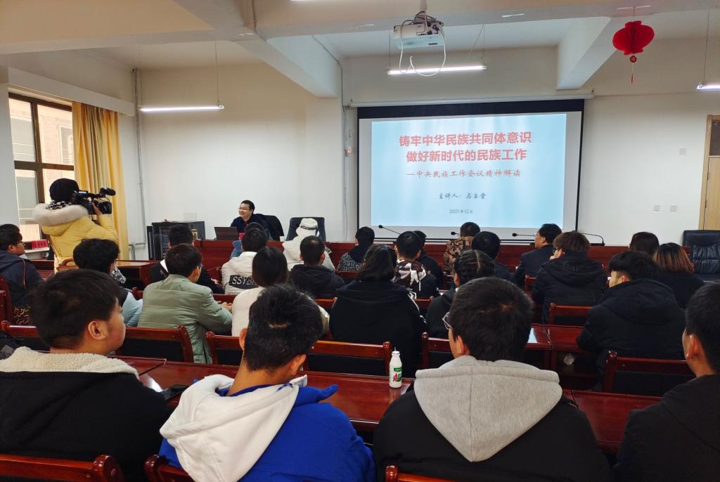 为深入学习宣传党的十九届六中全会精神,落实立德树人根本任务,12月18日,西北民族大学马克思主义学院马玉堂名师工作室来我院康乐校区开展送教活动,作了题为《铸牢中华民族共同体意识 做好新时代的民族工作——中央民族工作会议精神解读》的专题讲座。学院党委委员、副院长高忠有,康乐县统战部光彩事业指导中心主任马晗春,西北民族大学任荣老师,学院党委宣传统战部副部长、新闻中心主任李雪萍,思政部教师和学生代表参加了此次活动,活动由思政部部长王瑛主持。