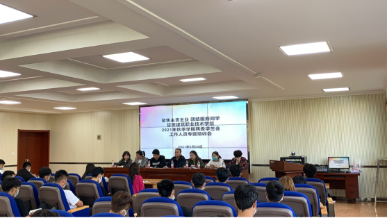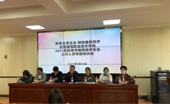 为严格落实学生会工作人员培训制度,以学生会制度落实为牵引持续深化高校学生会改革,深入贯彻落实从严治会制度,优化学生会组织工作作风,切实加强新时期学生会工作,甘肃建筑职业技术学院两级学生会以“聚焦主责主业,团结服务同学”为主题于9月28日、29日在学术报告厅召开“甘肃建筑职业技术学院2021年秋季学期两级学生会工作人员专题培训会”。团委书记张磊、六系团总支负责人以及两级学生会全体工作人员参加此次会议,会议由学生会专职秘书长董梓瑶主持。