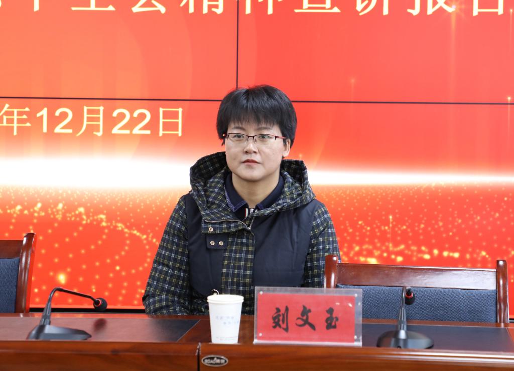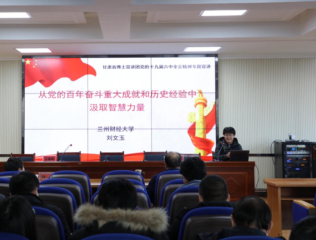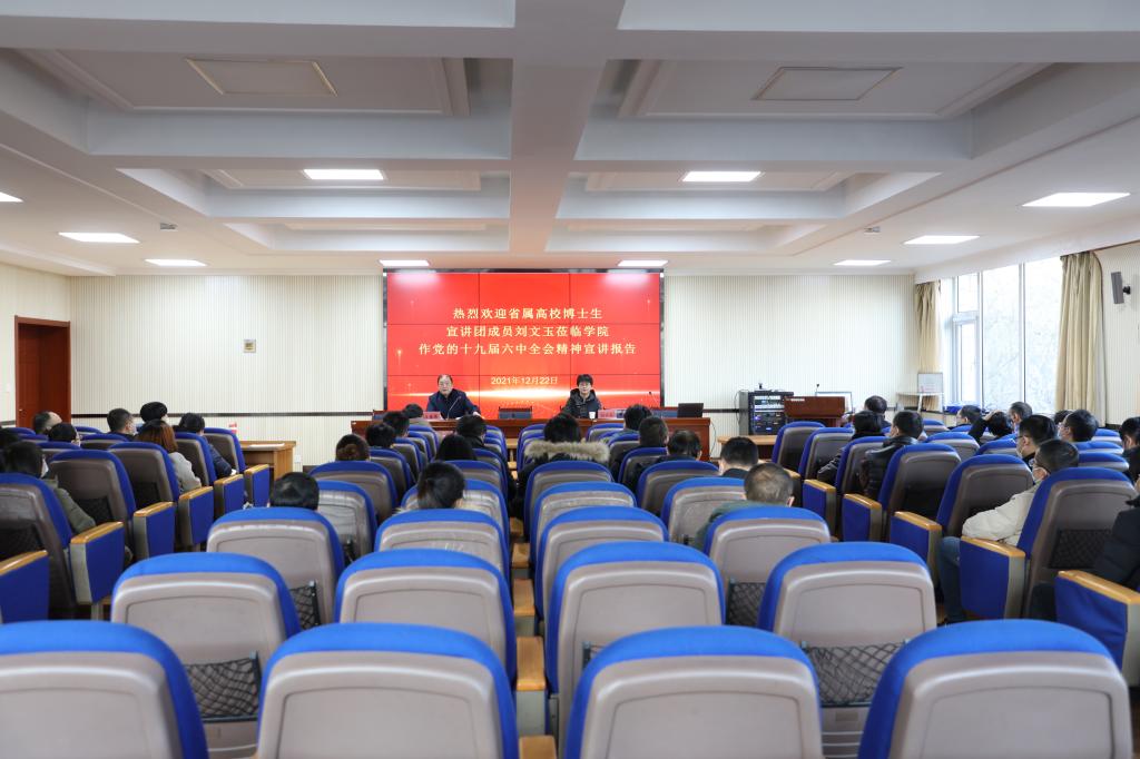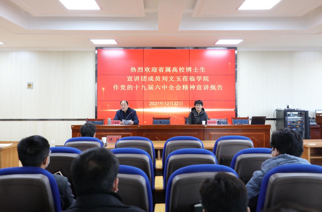 为全面准确学习宣传贯彻党的十九届六中全会精神,根据中共甘肃省委教育工作委员会、中共甘肃省教育厅党组党史学习教育领导小组的相关要求,12月22日,兰州财经大学党委宣传部副部长、新时代文明实践中心主任、马克思主义学院副院长、中国特色社会主义理论体系研究中心副主任刘文玉莅临我院,开展了党的十九届六中全会精神“博士生宣讲团”专题宣讲报告会。学院领导班子成员、全体中层领导干部、思政课教师和辅导员参加了报告会,学院党委副书记王继伟主持。