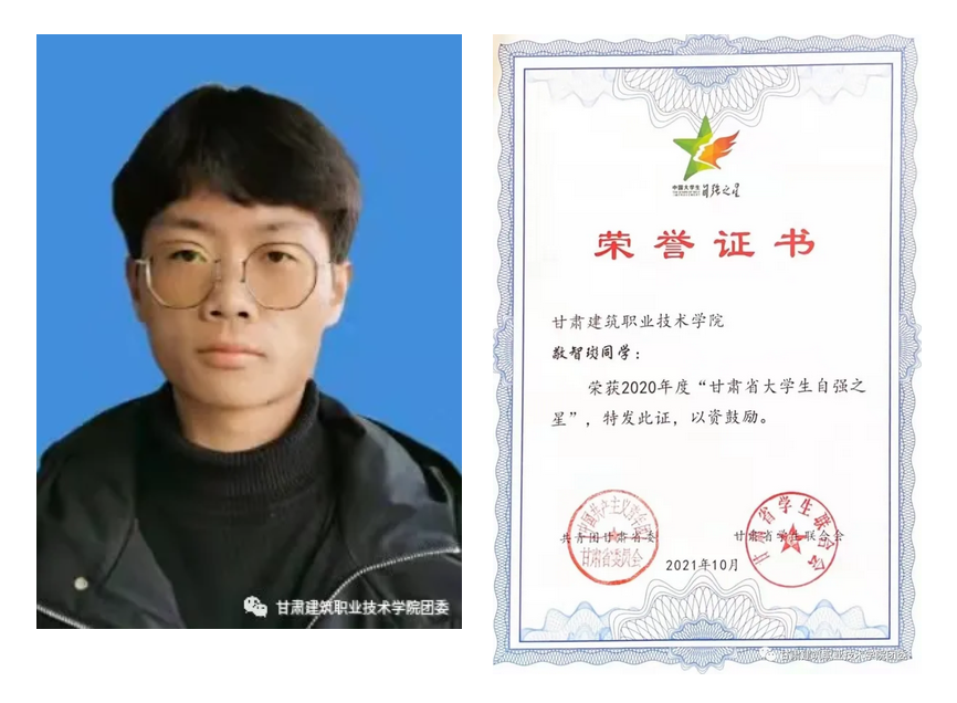 敬智珳,汉族,男,测绘地理信息系无人机应用技术,曾担任无人机协会副会长,他为人善良,善于助人为乐,团结同学,学习认真,成绩优异,品学兼优。曾获国家励志奖学金,《互联网+》项目在甘肃省创业计划竞赛中荣获铜奖、甘肃省金兰创新创业奖学金、全国大学生电子商务“创新、创意及创业”挑战赛甘肃省赛区省级选拔赛中荣获二等奖、多次获得校级三好学生等多项荣誉,积极投身社会实践,长期从事志愿服务。