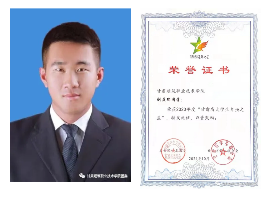 刘益瑞,男,汉族,出生于2001年,中国共青团员,甘肃建筑职业技术学院建筑工程系学生,在校期间先后获得多项荣誉。曾担任甘肃建筑职业技术学院社团联合会主席,建筑工程系19级水利水电一班班长。在校期间积极参加学院各类活动,在第十二届“挑战杯”甘肃省大学生创业计划竞赛中荣获金奖、第二届甘肃省黄炎培职业教育创新创业大赛银奖、甘肃省第二届高校毕业生就业创业故事征文大赛获得一等奖、荣获甘肃建筑职业技术学院预防艾滋病征文一等奖、荣获2020年-2021年学年度社团先进工作者、荣获2019年-2020年学年优秀学生干部、荣获学院第十五期青年马克思培训中优秀学员、荣获2020年-2021年学年被评委优秀共青团员、同时在校期间通过自己努力获得全国健身教练国家一级指导员证书。