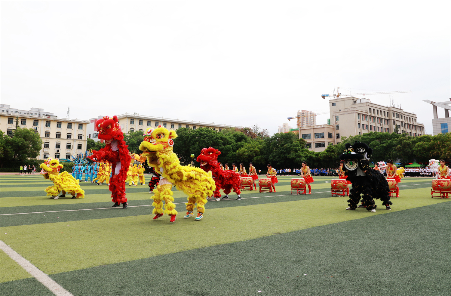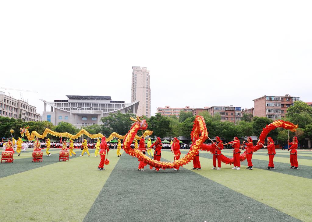 龙、狮、鼓表演伴随着激越的鼓点和恢宏的气势将现场的气氛点燃;由学院“非遗”传承客座教授和非遗传承人,田野、司马和曙老师带来的《花儿串烧》高昂激荡、余音缭绕。团体操舞蹈和红旗方阵描绘了在新冠肺炎疫情中学院师生和广大医护人员不畏艰难、奋勇向前的精神。