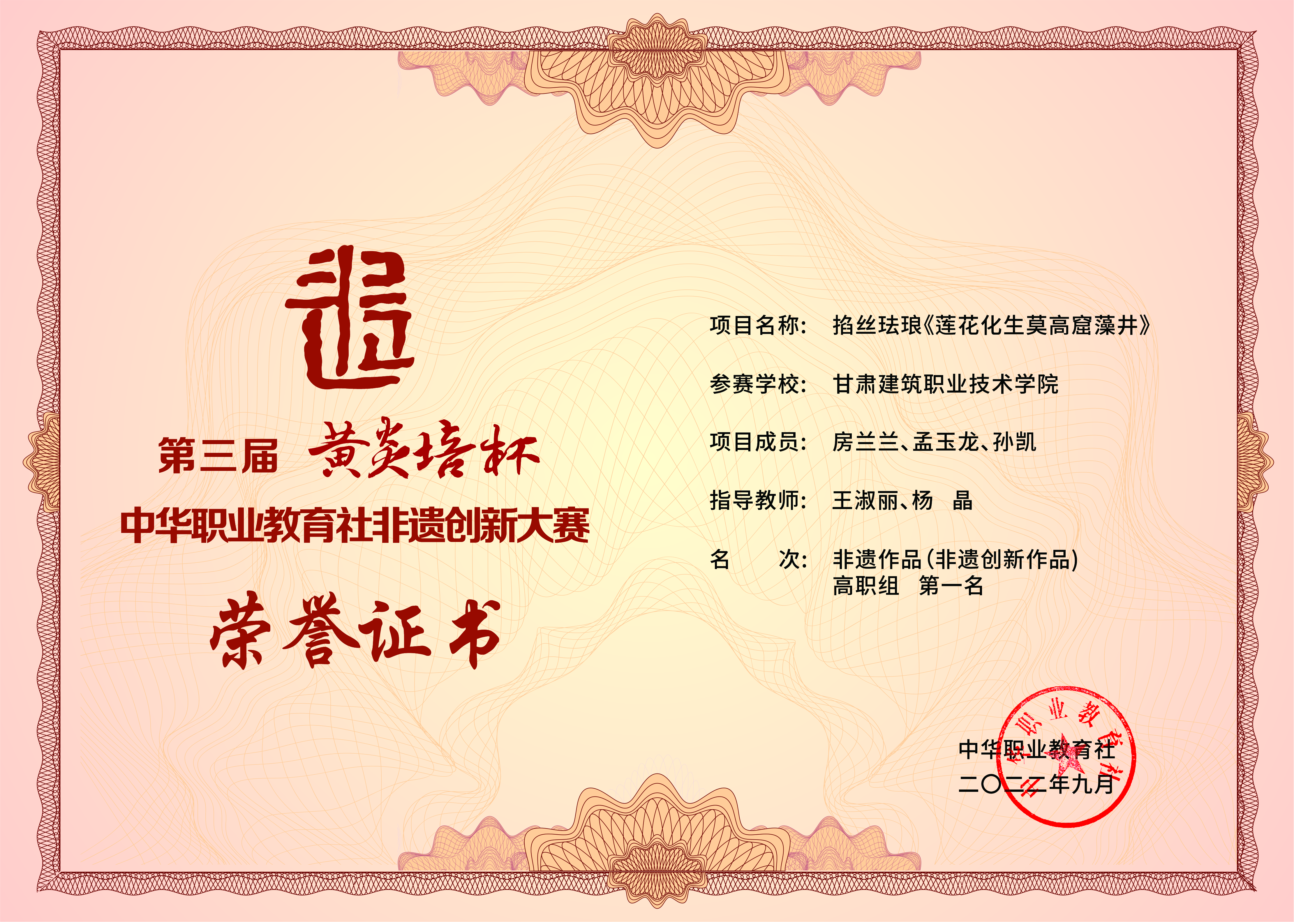 近日,由中华职业教育社主办的第三届“黄炎培杯”中华职业教育非遗创新大赛暨非遗职业教育成果展示会在南宁落幕。此次大赛中,我院共入围四组非遗创新作品,其中建筑系主任杨晶、陇派珐琅工艺师王淑丽指导,学生房兰兰、孟玉龙、孙凯完成的作品掐丝珐琅--《莲花化生莫高窟藻井》荣获一等奖;建筑系党总支书记蔡萍与甘肃省工艺美术大师、陇派珐琅非遗传承人李海明指导,学生王陆、李婕完成的作品掐丝珐琅--《莲花飞天莫高窟藻井》荣获一等奖;建筑系老师王向华、甘肃省高级葫芦雕刻艺术师白正兵指导,学生杨博森、王鹏杰、陈瑞完成的作品葫芦雕刻《福禄三宝》荣获优秀奖。