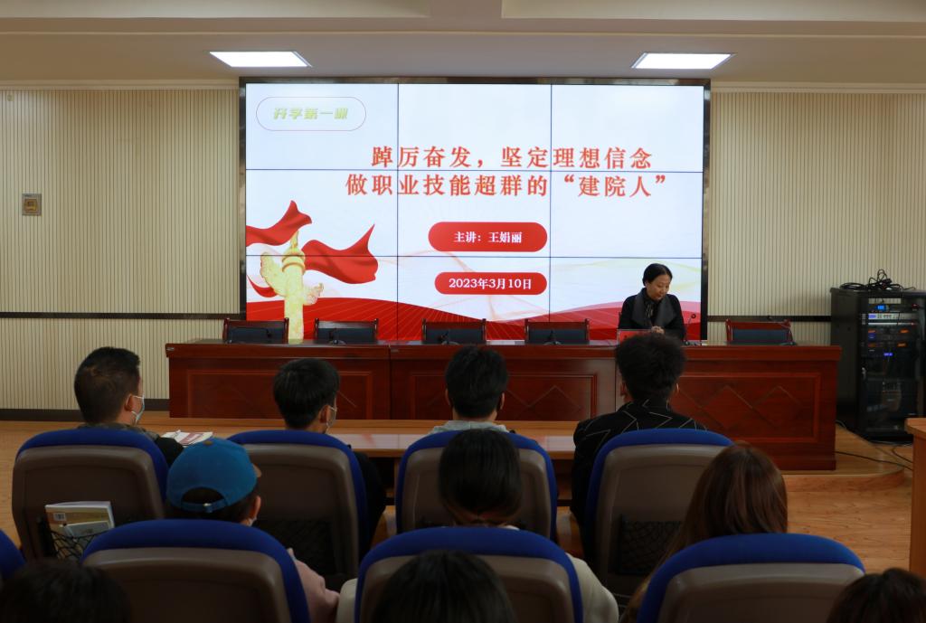 王娟丽同志以《踔厉奋发,坚定理想信念,做职业技能超群的“建院人”》为题,从前途广阔,大有可为;德技并修,行稳致远;志高笃学,创新有为三个方面,为师生上了一堂别开生面的“开学第一课”。首先从党的二十大报告中深刻揭示的新时代实施科教兴国战略、强化现代化建设人才支撑的地位作用切入,列举科技人力资源等数据,释放出全社会大兴识才、爱才、敬才、用才之风的强烈信号。通过建院学子鲜活的事例、翔实的数据向同学们论述了职业教育不是“终结教育”,也不是“低层次教育”,更不是“淘汰教育”,而是特色鲜明的一种教育类型。