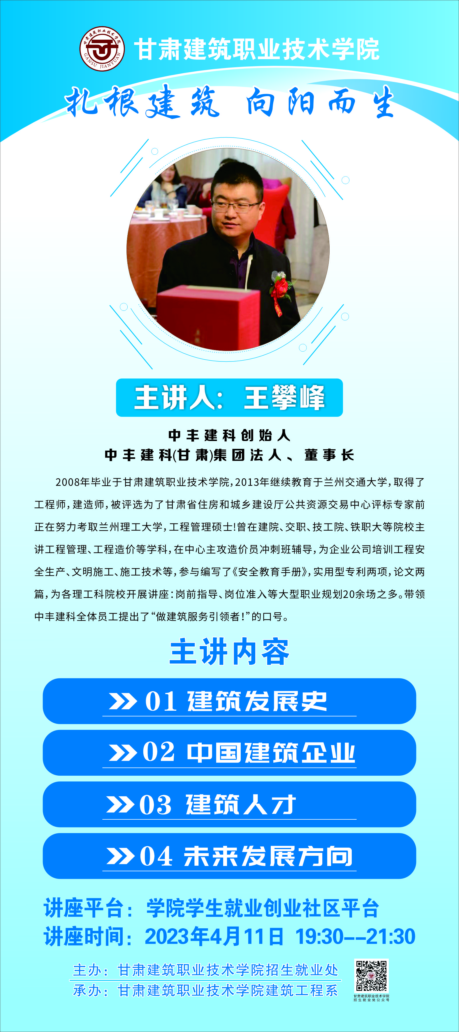 二、主讲人:王攀峰 中丰建科(甘肃)集团董事长、学院2008届毕业生
