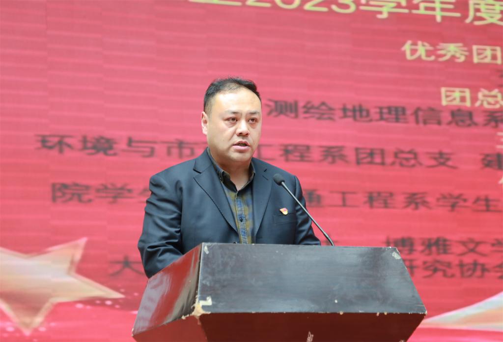 王娟丽同志致词。她代表学院党委、行政向全院团员青年致以亲切问候,向受到表彰的组织和个人表示热烈祝贺,向长期以来为我院共青团工作做出贡献的团组织、团员青年、教师表示感谢和慰问。她指出,五四运动是中国青年高举“爱国、进步、民主、科学”的光辉旗帜,为推动中国的前进树立起一座不朽的丰碑,纪念五四运动,关键在于传承五四精神,习近平总书记在党的二十大报告中殷切寄语广大青年人“立志做有理想、敢担当、能吃苦、肯奋斗的新时代好青年”,为新时代中国青年成长成才指明了方向。她讲到,在过去的一年,学院各级团组织紧密围绕党政中心工作,坚持服务育人大局,按照上级团委的工作要求,切实履职尽责,开展一系列活动,在青年工作各方面取得了较大进步。她强调,青年强则国强,青年立则国立,期望各位建院学子能够以信念坚定远大理想、以实干增强担当能力、以创新点燃筑梦激情、以奋斗点亮青春底色,弘扬“五四”精神,树立远大理想,让青春在为祖国、为人民、为民族的奉献中焕发出更加绚丽的光彩。