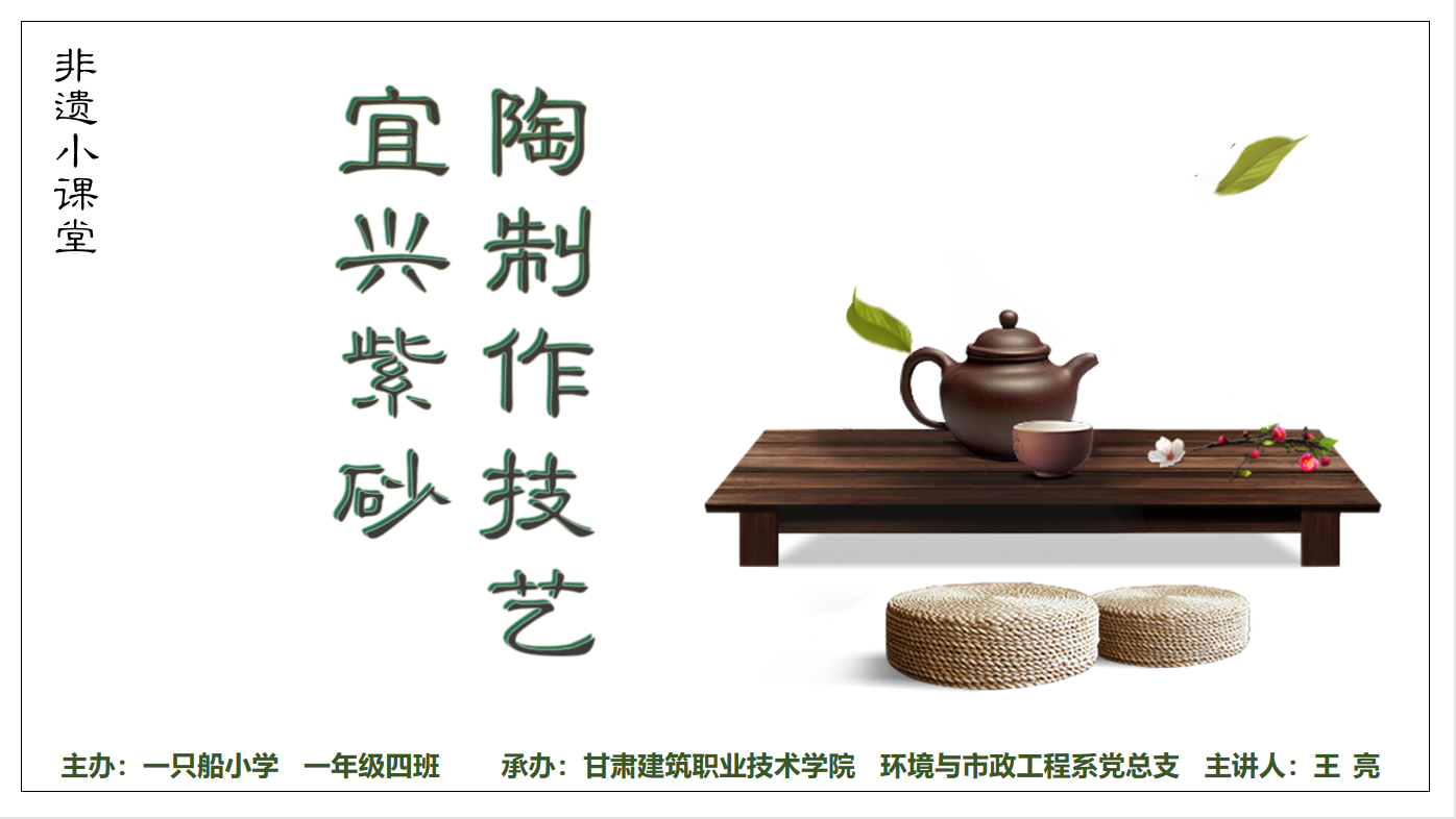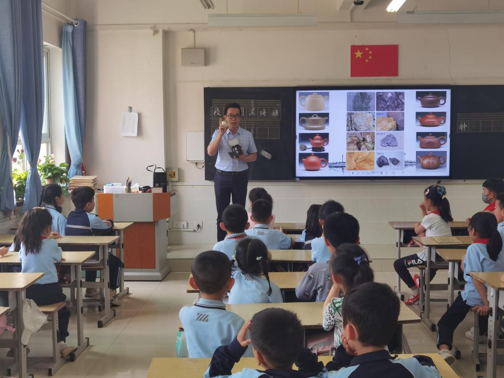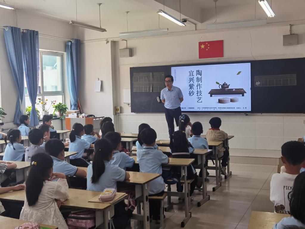 为进一步加强中国文化遗产保护,继承和弘扬中华民族优秀传统文化,推进社会主义先进文化建设,发挥党组织和党员在教育领域的引领作用,环境与市政工程系党总支、系属弘古轩工作室,受邀承办了一只船小学一年级四班“非遗小课堂”活动。6月7日,环工系党总支书记王亮,弘古轩工作室负责人王菲前往一只船小学,送上“非遗小课堂”第一节授课内容——“宜兴紫砂陶制作技艺”。