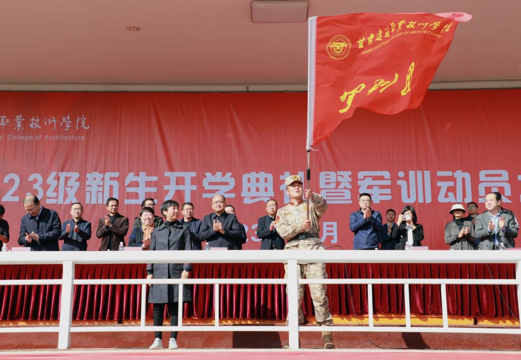 党委委员、副院长许洁宣读了《关于成立甘肃建筑职业技术学院2023级新生军训团组编的决定》。王娟丽同志为军训团授旗。