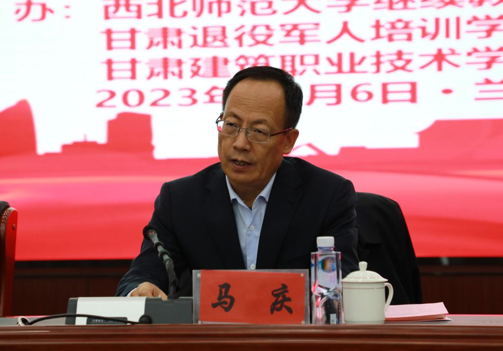 马庆同志在致辞中介绍了西北师范大学的办学历史、人文底蕴及近年来取得的成绩,他表示,此次培训体现了省退役军人事务厅对退役士兵成长发展的高度重视和亲切关怀,希望各位学员能够继续发扬军人的优良传统和作风,积极主动参与学习任务,以过硬的思想素质和专业水平迎接新的机遇和挑战;其次,要遵守培训纪律,以谦虚、谨慎、好学的态度,全面提升自身综合素质,为成为一名优秀教师打好基础;最后,要加强服务管理,做好培训工作的沟通和协调,确保教学质量和培训成果。