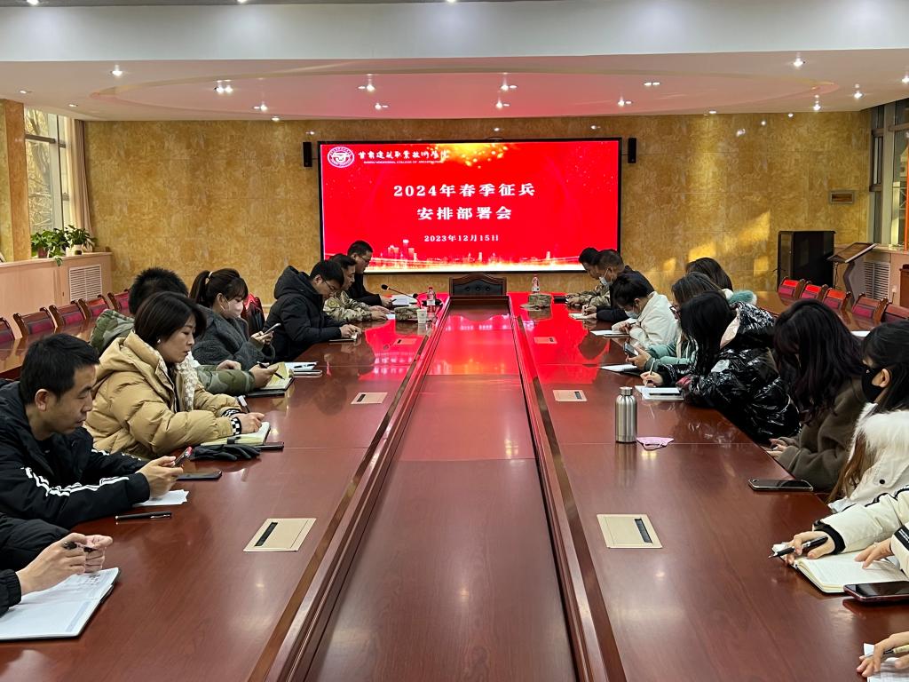 为进一步做好2024年春季征兵工作,鼓励更多优秀的大学毕业生应征报名参军,12月15日,学院召开2024年春季征兵安排部署会,学生工作处处长许庆兵,七里河区人武部部长谢宏胜,学生工作处副处长张希玮,全体毕业班辅导员参加会议,许庆兵主持会议。