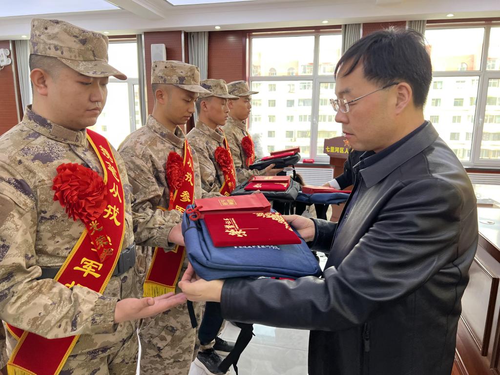 欢送会上,参会人员为28名预定新兵佩戴红花和绶带,并颁发“参军报国优秀大学生”荣誉证书、参军纪念品、慰问品。
