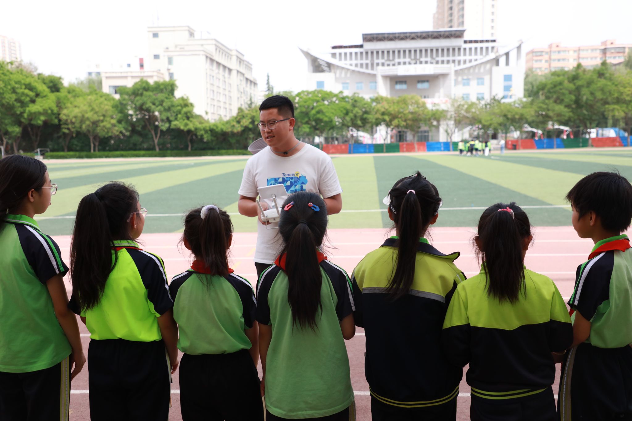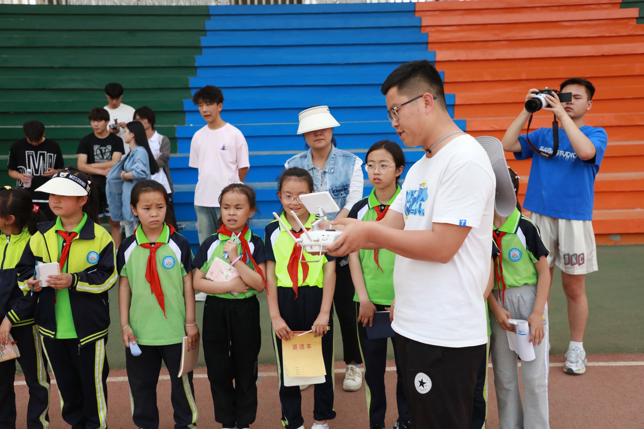 5月16日,学院测绘地理信息系组织了一场无人机科普教育活动,兰州市七里河区晏家坪第二小学的若干名小学生在老师的带领下参与了本次活动。活动旨在通过实地参观和体验,让小学生近距离接触无人机,了解无人机的飞行原理和在现代社会低空经济中的应用和发展前景。