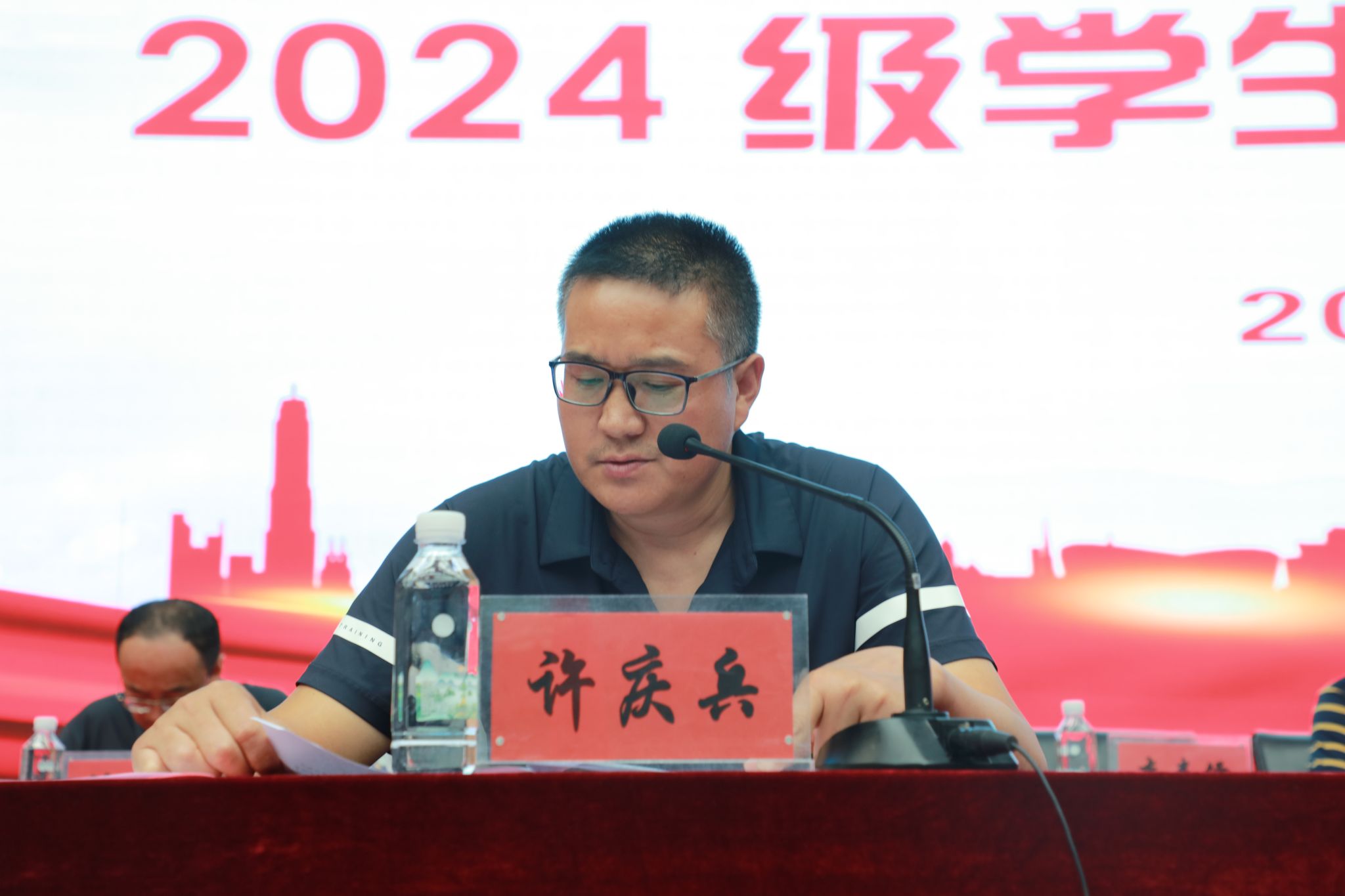 军训团政委、学校学生工作处处长许庆兵宣读《甘肃建筑职业技术学院2024级学生军事技能训练工作方案》,具体就军训内容和相关要求做了说明。