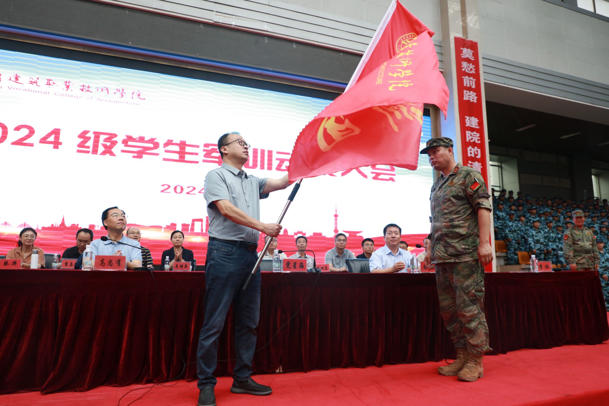 杜彦斌同志宣读了《甘肃建筑职业技术学院关于组建2024级学生军训团的决定》。党星海同志为军训团授旗。