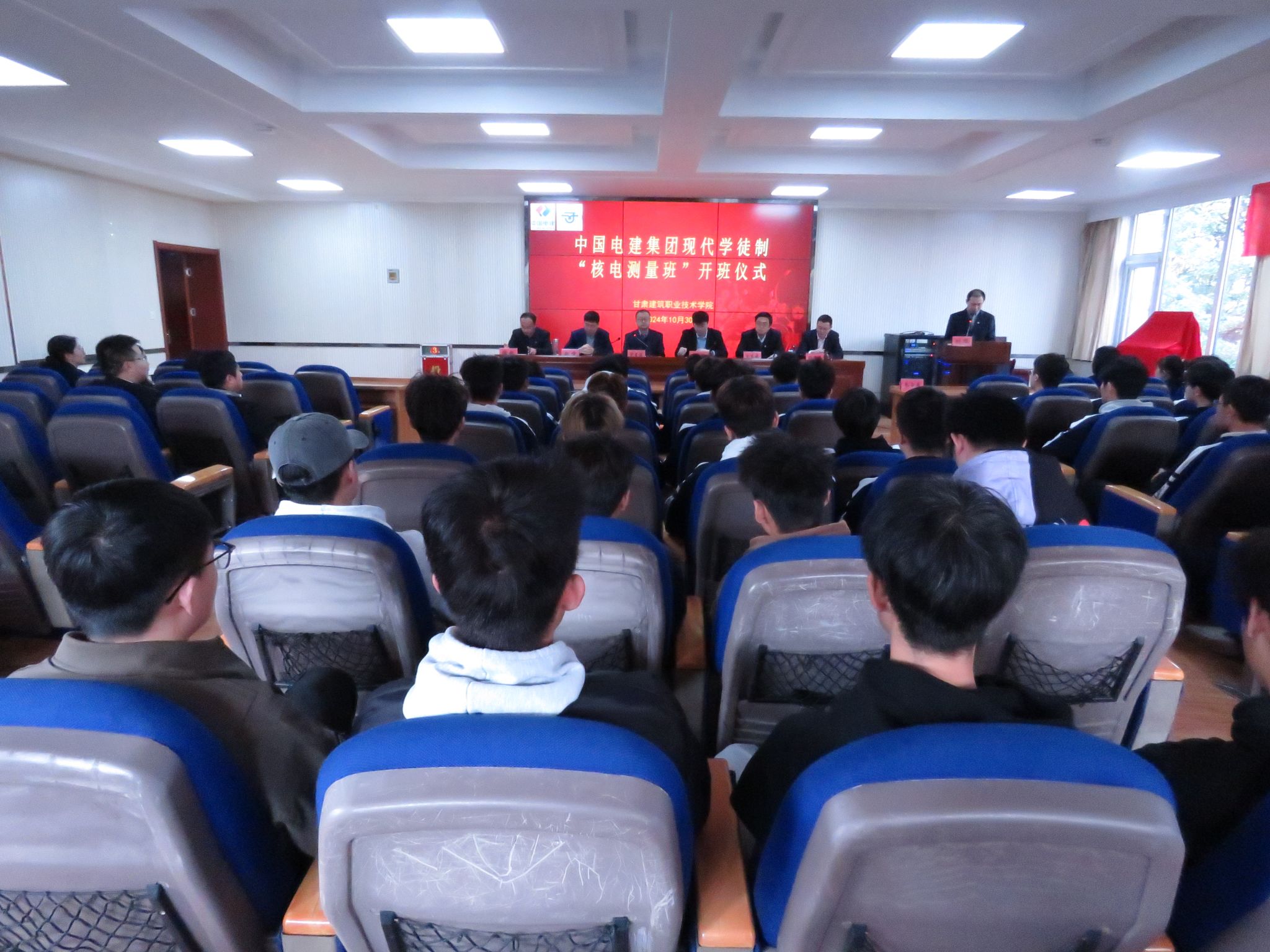 10月30日,甘肃建筑职业技术学院与中国电建集团核电公司举行现代学徒制“核电测量班”开班仪式。学校党委副书记、校长党星海,中国电建集团核电公司人力资源部主管于辉超,中国电建集团核电公司建筑测量技术中心负责人赵峰,学校招就处处长王东晓,测绘地理信息学院党总支书记徐敏,测绘地理信息学院院长刘攀,教务处副处长张宝鹏以及测绘地理信息学院教师代表,“核电测量班”全体同学参会。会议由刘攀主持。