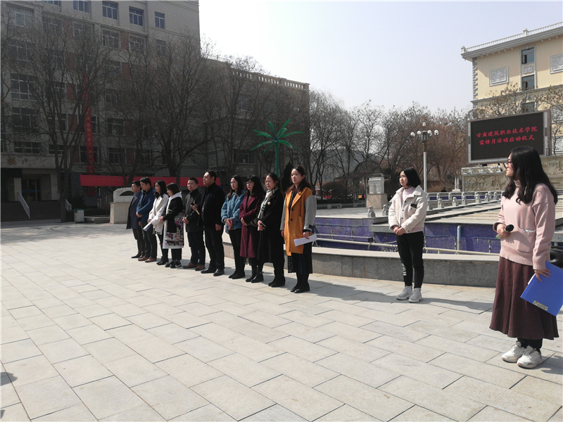 3月5日甘肃建筑职业技术学院于文化广场举行2019年学雷锋月启动仪式,学院各级团学组织广泛参与,学院党委书记、院长王娟丽在向全院师生一封信中提到:各位师生要以学雷锋日为起点,把握时代新要求,结合自身特点和所学专业广泛开展帮助他人、奉献社会、报效国家的志愿服务,要深入宣传习近平新时代中国特色社会主义思想,生动践行为人民服务的理念追求,大力弘扬主流价值、主流文化,以志愿服务为运行机制推进新时代文明实践中心建设。将志愿服务做实做细,切实的发挥甘肃建院助力脱贫攻坚、服务建筑行业、服务地方的学院特色优势,将志愿服务工作在甘肃建院生根开花。